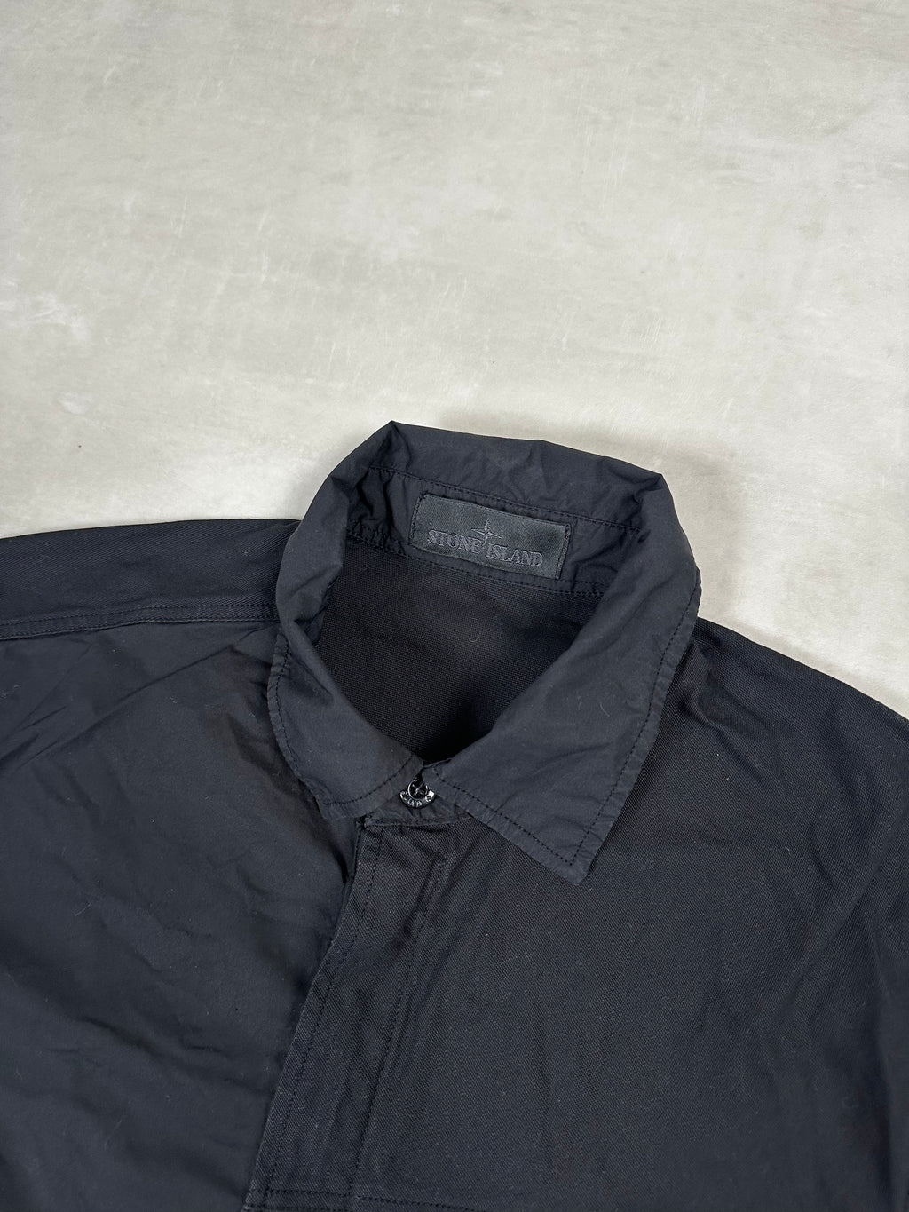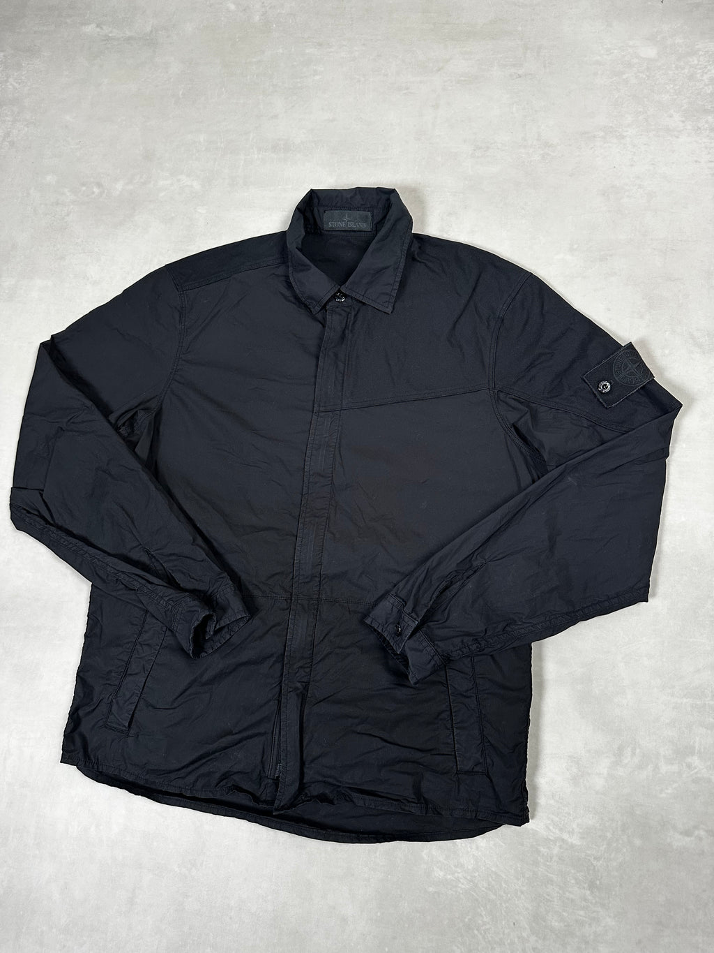 Fit is closest to that of a standard Stone Island M. The normal chest measurement for Stone Island M Overshirts is 21".